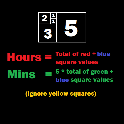 The screen of the clock is made up of five squares whose side lengths match the first five Fibonacci numbers: 1, 1, 2, 3 and 5. The hours are displayed using red and the minutes using green. When a square is used to display both the hours and minutes it turns blue. White squares are ignored.